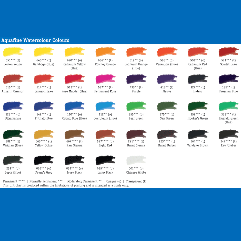 Akvarellfärg i studiekvalitet med delvis ersatta pigment (Hue). Ytterst finmalda pigment för bästa briljans. Kakor av typen "moist". Kopp i standardstorlek.