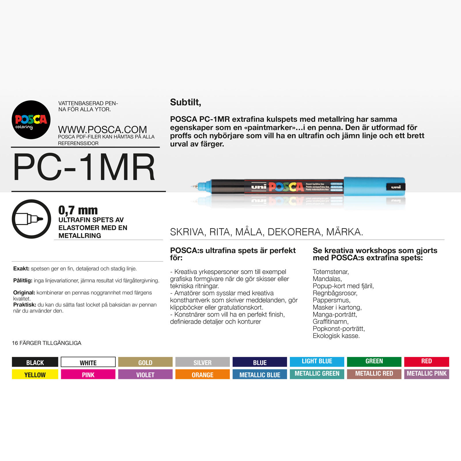 POSCA PC-1MR extrafina kulspets med metallring har samma egenskaper som en «paintmarker»...i en penna. Den är utformad för proffs och nybörjare som vill ha en ultrafin och jämn linje och ett brett urval av färger.